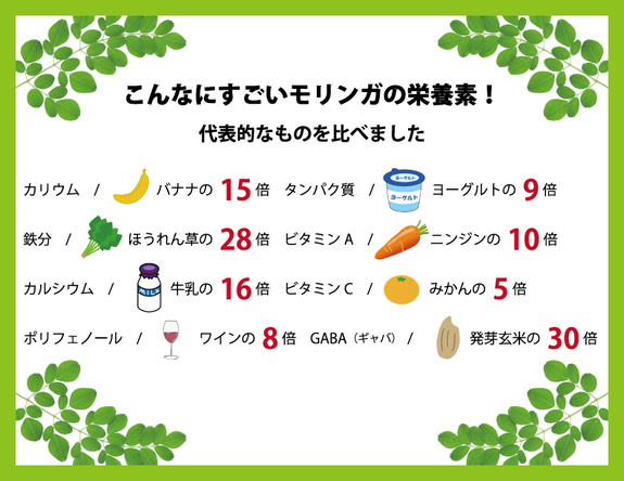 10万種類の植物の中でナンバーワンの栄養価とお伝えしましたが、注目すべき点はその栄養価のバランスの良さです。人間に必要なほぼすべての栄養素が豊富に含まれています。ビタミン類、抗酸化物質、主要なたんぱく質がずば抜けて多く含まれているほか、90種類以上の栄養素、46種類もの抗酸化物質、36種類もの抗炎症物質を持ち、さらに必須アミノ酸、ミネラル、鉄分、亜鉛、などなどテレビなどで一度は聞いたことのある栄養素がこれでもかと詰まっている植物です。