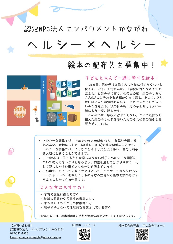 そのために、子どもや保護者に関わっている方(子育て支援、性教育の実践、図書館などをされている方々、小さなお子さんとその保護者の皆さま)に絵本を配布し、活用してもらい、「ヘルシーな関係」を多くの人に広めていきたいと思っております。