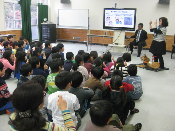 生徒さんは小学校3、4年生、そして後ろは中山五月台の地域住民の方々。まずは「きこえないことって?」を説明したあと、「聴導犬」のことを説明しました。