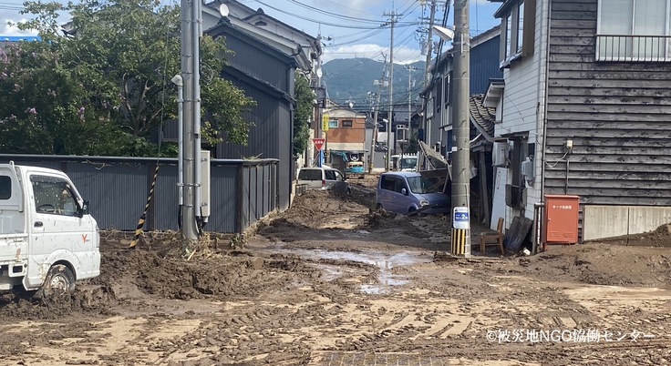 また、「NPOパートナー協働事業」で連携する神戸のNPO、被災地NGO恊働センターは今回の豪雨を受けて、拠点のある七尾市小牧から2手に分かれて支援を開始。輪島市や珠洲市の断水地区などで飲料水や土嚢袋を届けつつ、建物内外の泥かきなどを手伝っています。背丈ほど水が入ってしまった建物もあり、片付け作業には人手が必要だと言います。 被災した方は「弱り目にたたり目。地震の次は水害で言葉が出ない。能登は自然豊かで風光明媚ないいところだったのに」と涙を浮かべながら話していたそうです。