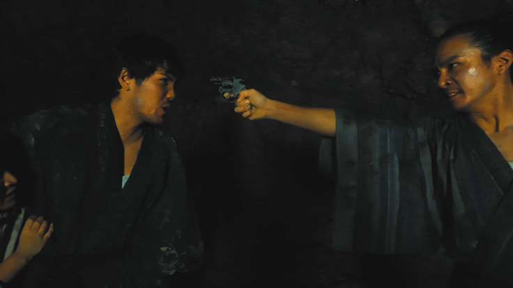 彼は劇中、ほかの3名に銃口を向けます。その際、かならず相手を下に見ようとします。