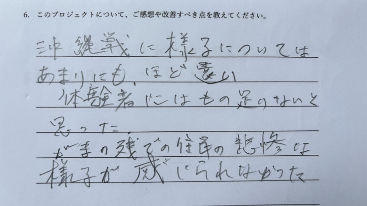 現在は県外の教育委員会におります。研修の関係で沖縄に来ており、沖縄戦についての理解を深めようと思い、延泊をしました。偶然、平和劇の情報について知り、来場しました。演劇は、感情に直接訴えてくる迫力で、涙があふれてきました。今回受け取ったメッセージを、わたしも地元で伝えていかねばと思いました。(40代/男性)