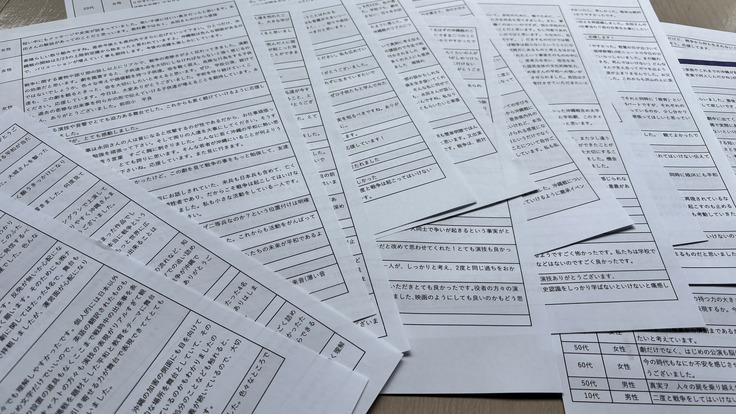 平和劇を作り上げている人達の「戦争を繰り返してはいけない」という思いが演劇にすごく詰められていたなと思いました。わたしの周りには戦争体験者がいないので詳しく知る機会がありませんでした。今回の演劇を通して、戦争はしてはいけないことなんだと実感したし、10代だからできることを広めていけたらなと思います。(10代/女性)