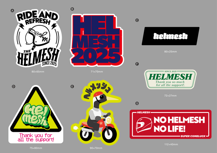 ヘルメッシュステッカーは、このデザインのどれかが返礼品として届きますのでお楽しみにしてください。ちなみにサイズはヘルメットやバイク、スマホにさり気なく貼れるくらいを予定しています。