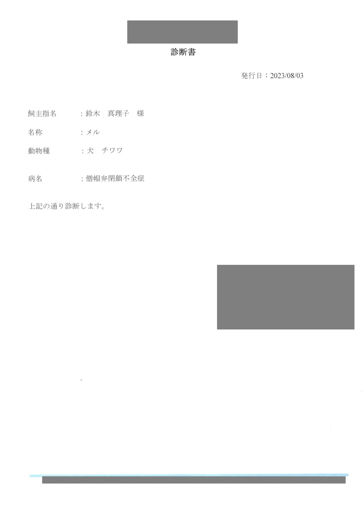 ページ上に掲載している診断書や診療明細書などの資料は全て動物病院から掲載の許諾を得ております