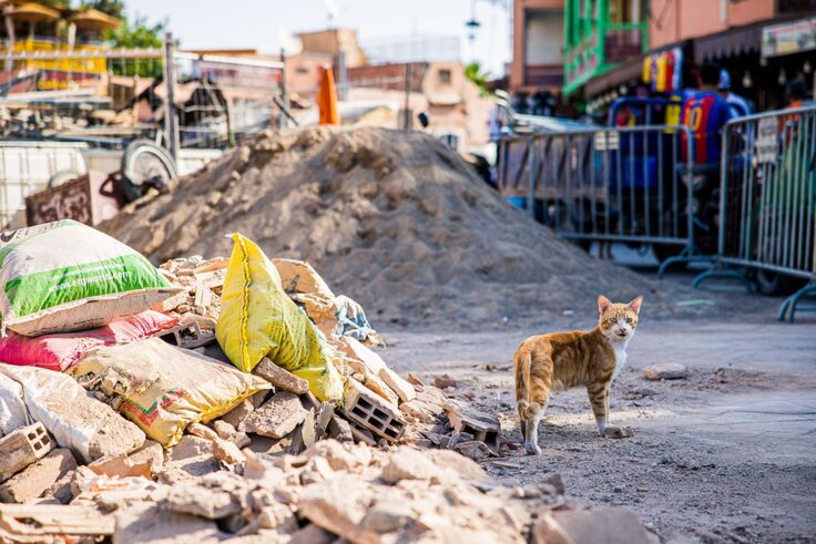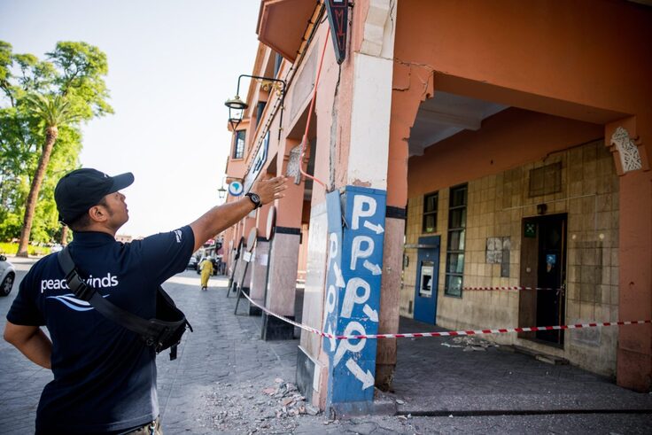 現地時間9月12日11:00(日本時間9月12日19:00)緊急支援チームは、モロッコ中部の都市マラケシュの旧市街にて被災状況の確認を行いました。震源地はマラケシュの街から70kmほど南西の山間部ですが、マラケシュ市内でも古い建物の多い旧市街では家屋の一部が損壊するなどの被害が出ていました。