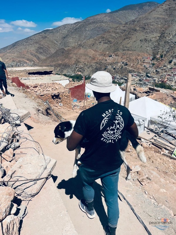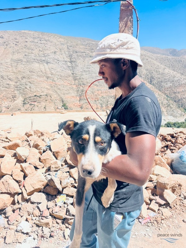 こうしたパトロールで見つかったオス犬のタラ(Tara)についてご紹介しましょう。MAAは発災後6日経ってから2度目のパトロールを行いましたが、被害の大きな山間部のImi N’tala村で、誰もいない家の前に座るタラを見つけました。ケガはしていませんでしたが、村は壊滅状態で人はおらず、食べるものもほとんどない村にひとりぼっちで取り残されていました。