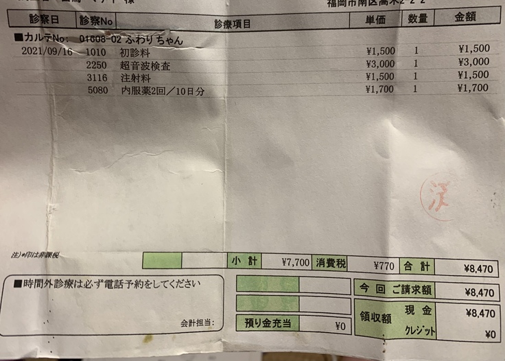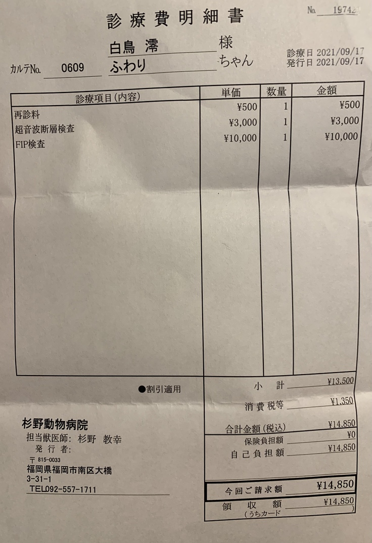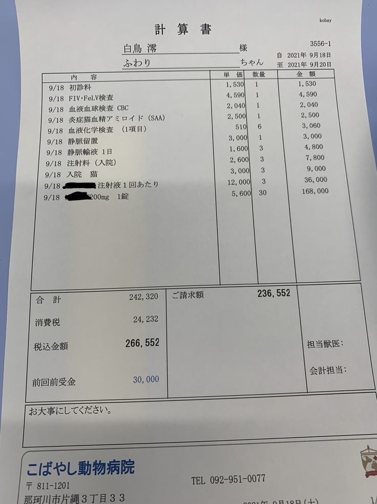 しかし、ふわりちゃんの医療費は今回の入院と、20日分のお薬だけで非常に高額なものになってしまいました。