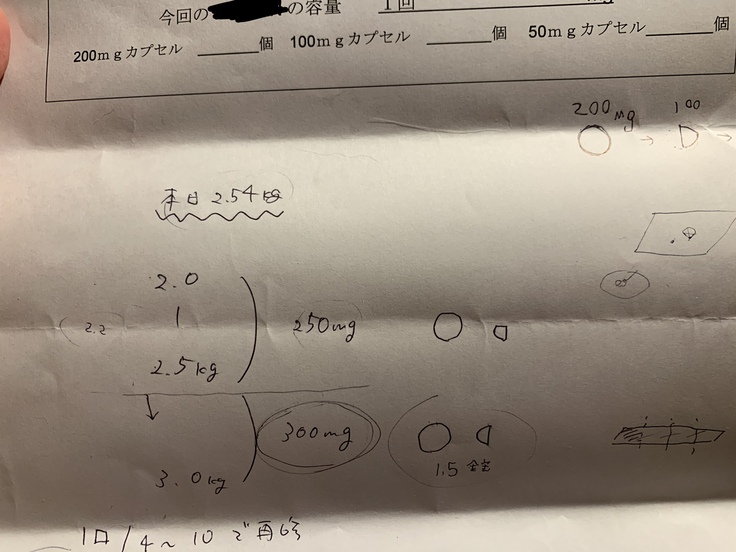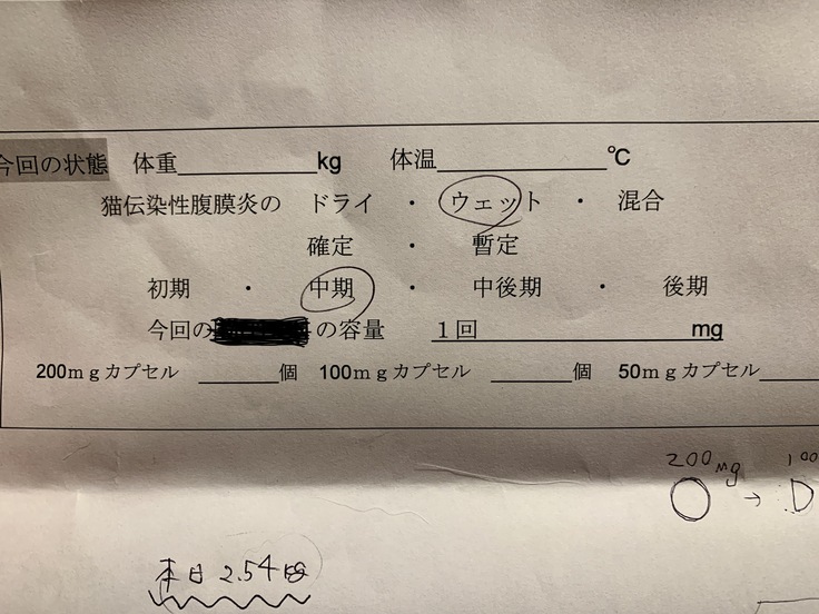 投薬開始時点で体重2.54kg・FIPウェットタイプのふわりちゃんが1日に必要な投薬量は300mgです。