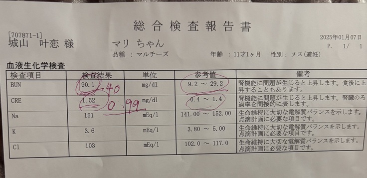 12月は週ごとに利尿剤を減らしていき、なんとかクレアチニン、BUN共に基準値に入った状態で年を越すことが出来たのですが、