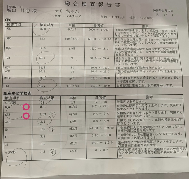 幸い、貧血も起こしていなければ白血球も正常で肝臓にもダメージは見られず。