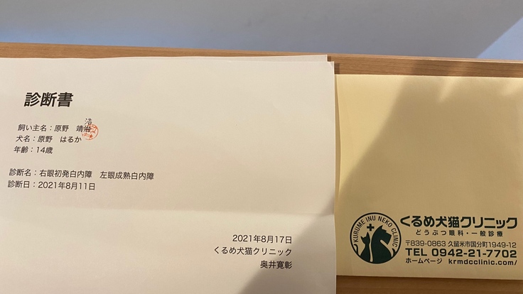 幸いな事に近郊の久留米市に動物眼科専門医(くるめ犬猫クリニック)があり、白内障手術が可能であれば視力の回復の可能性があるとの事です(かかりつけ医紹介のもと2021/8/11受診)