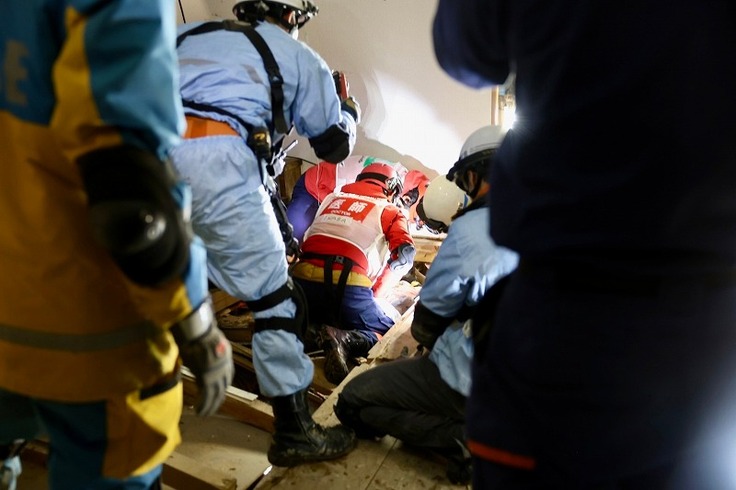 発見されてからおよそ3時間。処置をはじめた当初は脱水、低体温症の症状が見られ、体は冷え切ってかなり危険な状態でしたが、点滴や薬を施しながら体をあたため続け、クラッシュシンドロームの危険性を抑えられたことを確認してからレスキュー隊が救出。ABC(気道・呼吸・循環)が確認されると、女性は待っていた救急車に運び込まれ、病院に搬送されました。