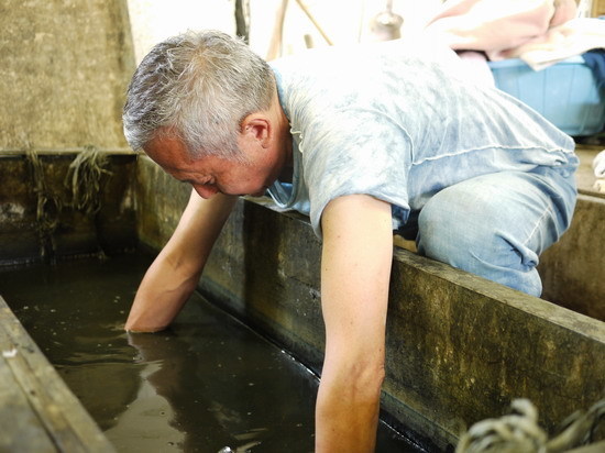藍の液が波立たないようにゆっくりと布を染めるのが正藍染めの染め方。