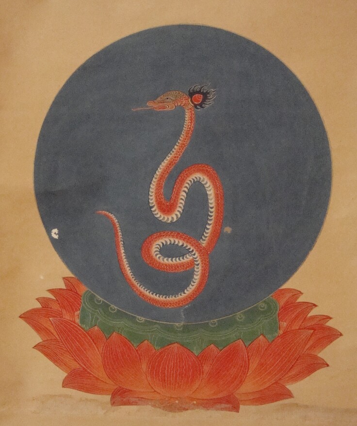 大学生だった私に仏教の知識はなかったため、母に訪ねてみたところ「倉庫に蛇が描かれた仏画がある」と教えらました。初めて入る倉庫には、かつて宝蔵に収められていた仏画・聖教が大量に保管されていました。母のいう蛇が描かれた仏画とは「星曼荼羅」のことであり、すぐに見つけることができました。