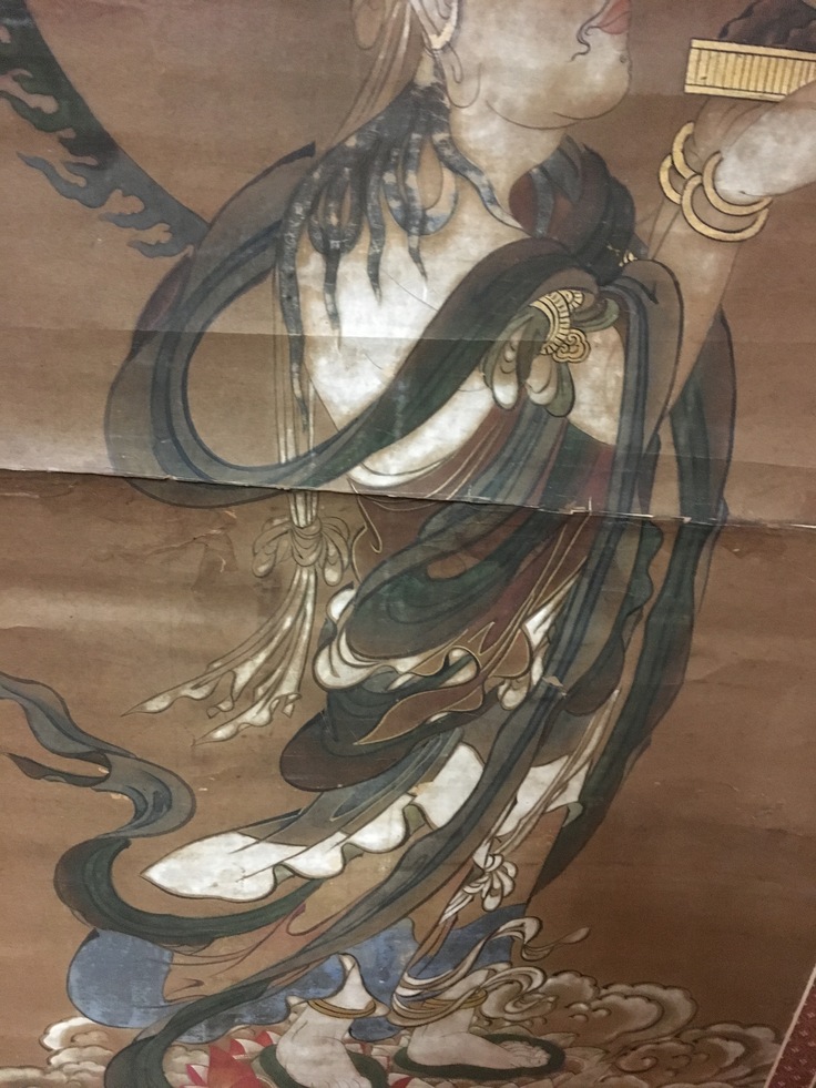 修復を待つ仏画(月天)、絵の部分が割れて早急な修復が必要です。