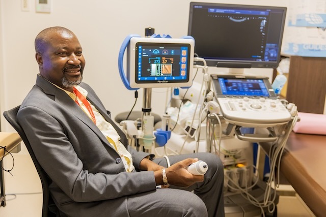 肝臓が硬くなってきた方に治療を行うことは、肝がんの予防のために大切であり、その肝臓の硬さを容易に測定できるのが、フィブロスキャンです。江口先生は、病院での診察はもちろん、モンゴルでの肝炎対策支援などでも、ポータブルのフィブロスキャンを持ち歩き、活用されています。