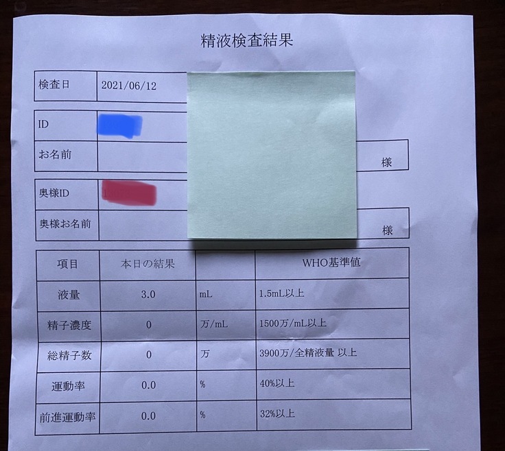 (2021年6月に受けた精液検査の結果、精子数0が判明しました)