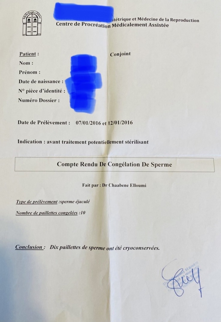 結果を聞き夫婦共々ショックと悲しみで愕然としていましたが、夫はチュニジアで化学療法を受ける際、将来このようになる事を懸念し、精子凍結保存について病院へ相談をしていました。医療に関しては比較的高い水準で整っているチュニジアですが、信仰や道徳観念から精子や卵子の冷凍保存、人工授精や体外受精に対して消極的な意見もまだ残っており、公に推奨されているわけではありません。幸運にも夫の病院は国内でも有名な産科が入っており、不妊治療も対応していました。精子凍結保存に関しても、治療開始前の手続きで行う事が可能となっていました。夫は私たちの幸せな未来のために賢い選択をしてくれていたのです!