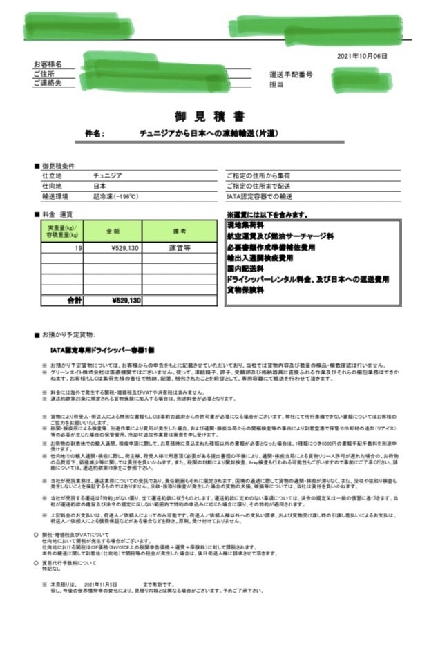 (凍結精子輸送のみの見積書。こちらは基本料金との事…)
