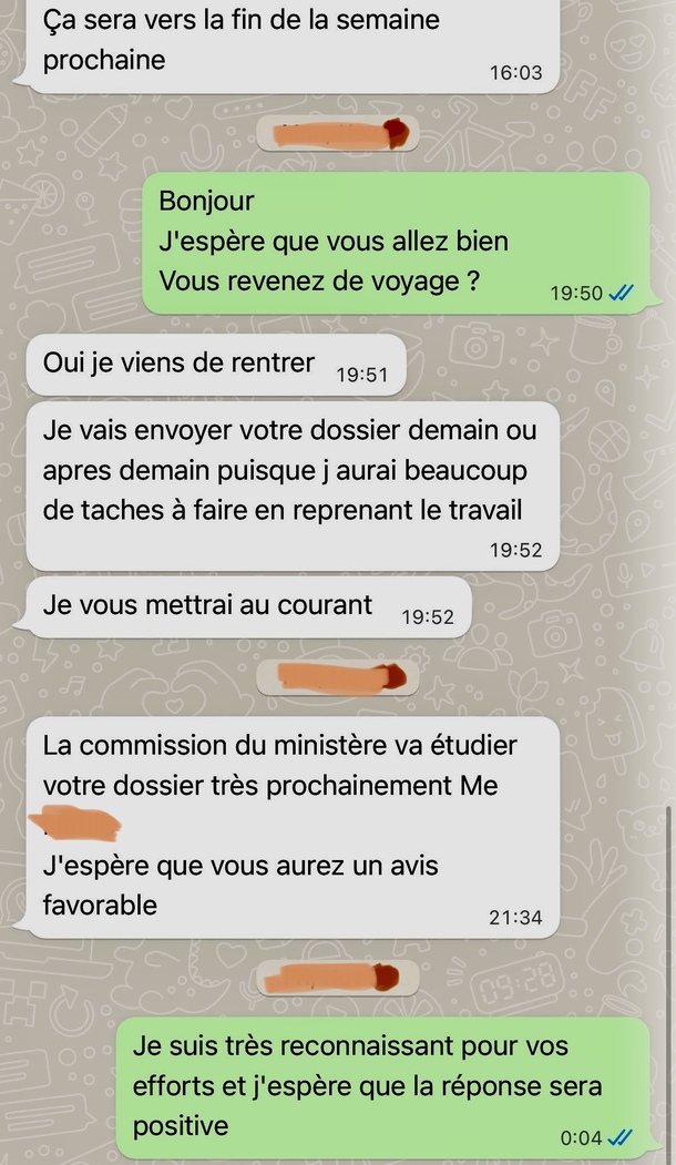 チュニジアで病院手続き書類の作成や省庁への提出をお願いしているクリニック担当者と夫とのメッセージでのやり取りです。