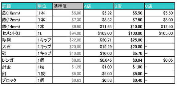 基準値は、現在シェムリアップで建設中の学校で購入している資材の金額です。
