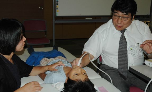 ▲2015年6月21日、那須町での「子ども甲状腺検診」風景。検診医師は、北海道がんセンター名誉院長・西尾正道氏。