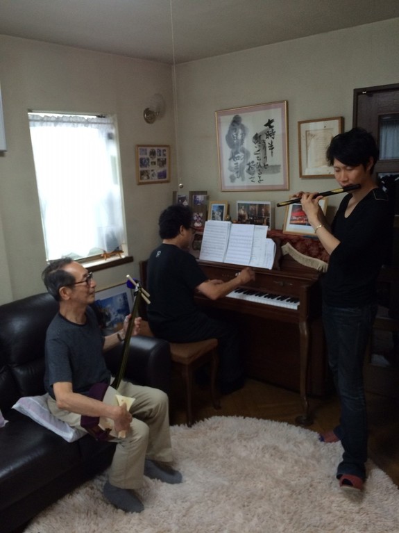本日は新しい曲への稽古!笛の山崎泰之さんも加わって!乞う ご期待!!!