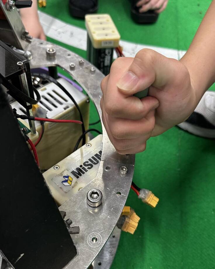 ロボットが動いている時、ものすごい振動や衝撃が発生してバッテリーが外れないように工夫しています!