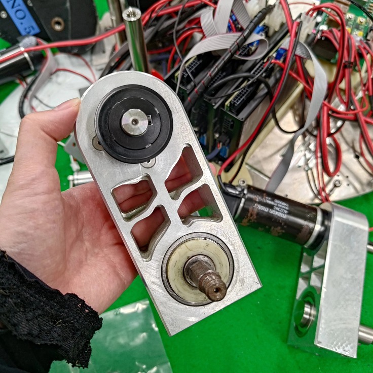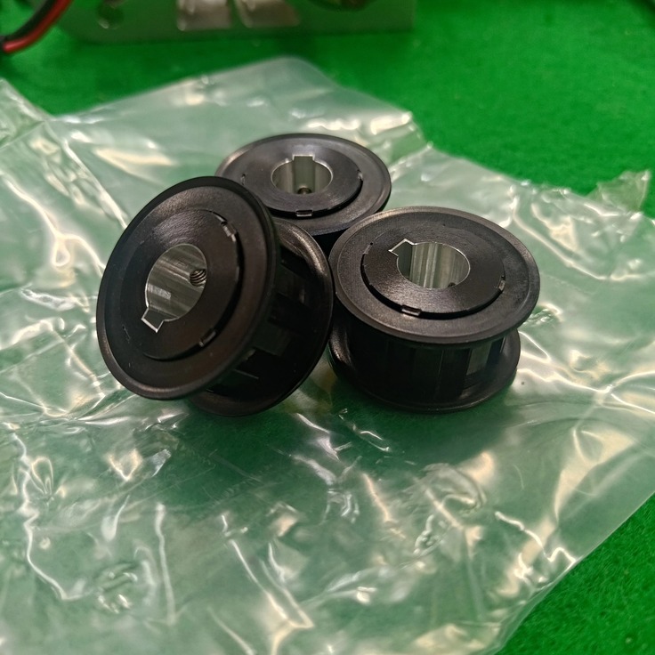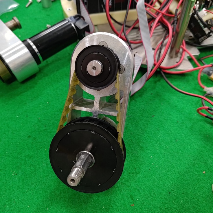 今日はモーター部分の小プーリーが届いたので、取り付けを行いました!モータの動力は、プーリを使ってタイへ伝達しています。その際の伝達部分をつなぐベルトをはめるのがとても大変でした
