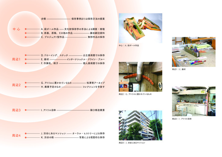 作品だけでなく、作品の生まれる周辺にも目を向けて、中心から周辺へ同心円状に広がるイメージをもとに、最終的に以下の図に示す5つの領域に分類しました。そして、分類した5つの領域について、保存事例の調査や今後の保存方法の検討を行いました。