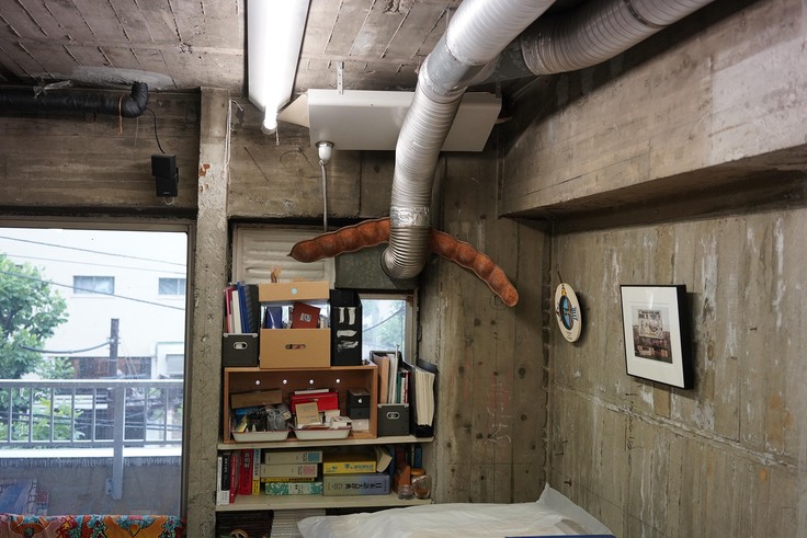 このアトリエは1980年代後半に日比野氏が入居した後、制作の場、事務所、倉庫、あるいは生活の場といった役割の変遷を経ながら現在に至っています。この役割の変化は、段ボール作品などの「モノ」から、パフォーマンスやアートプロジェクトといった「コト」への作品の変容や、日比野氏自身の制作活動拠点の移動や広がりともリンクしていると考えられます。