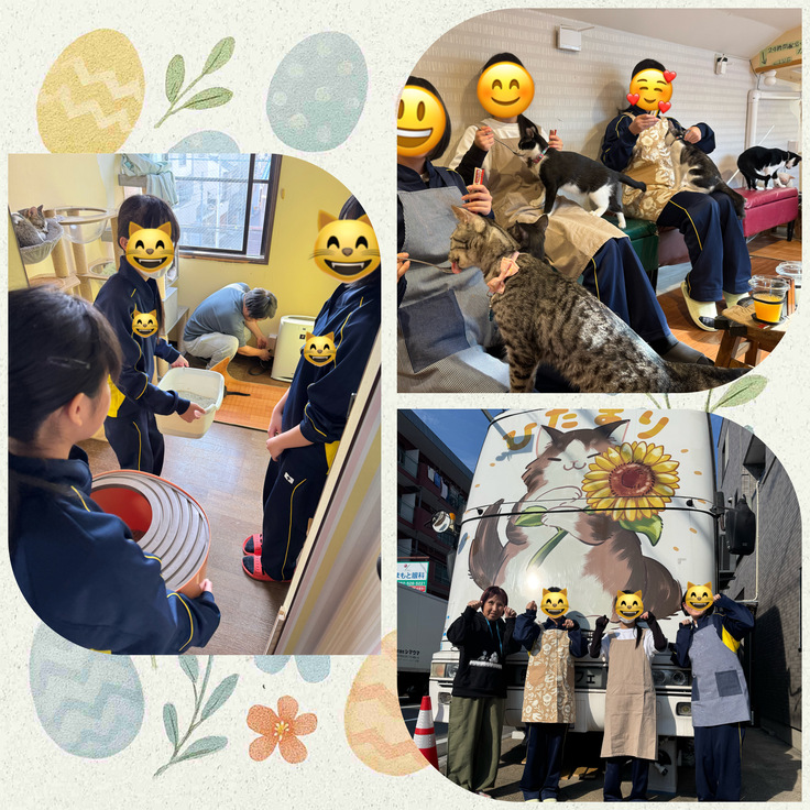 ひだまり号では、毎年、学校からの依頼を受けて、中学、高校、大学、専門学校の職業体験を受けています。みんな、一生懸命、掃除、猫の世話を楽しそうにやってくれます。タウンスクーリングのひだまり号に興味がある不登校の子たちも受け入れています。 学校には行けないけれど毎週喜んで来てくれています。若い人たちに猫との関わりを通して命の重さを知ってもらう良い場となっています。