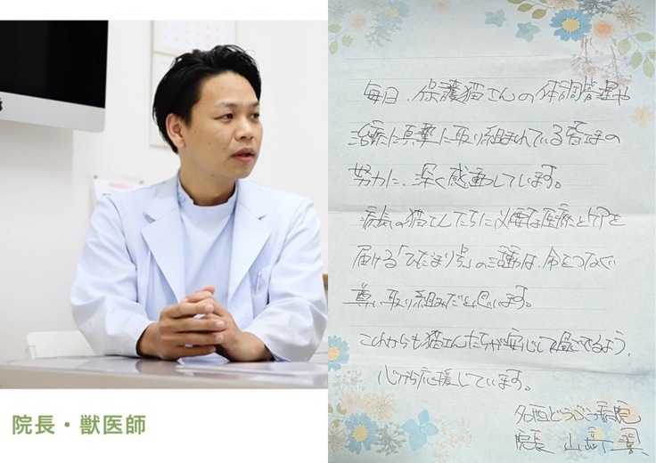 私は横浜市のブルーム動物病院の院長の片山です。いつも猫ちゃんを助けていただきありがとうございます。ひだまり号の祖父江さんとの出会いは、私の病院が開業した2019年の夏ごろです。FIPの治療を始めてこれから治療を広めていけたらというときにたまたまひだまり号の猫ちゃんFIPの子がいまして、祖父江さんからご連絡いただき、当院で治療をしていった時が最初です。それ以降、FIPの相談や他の猫ちゃんの病気のことでも相談を受けながら、祖父江さんにはたくさんの猫ちゃんを助けていただきながら、新しいご家族のもとに猫ちゃんを届けるといった活動も力を入れていただき、感謝しております。これからも地域に密着した保護猫活動をしていただくためにも、皆様から活動資金にご協力いただけると嬉しいです。どうかよろしくお願いします。