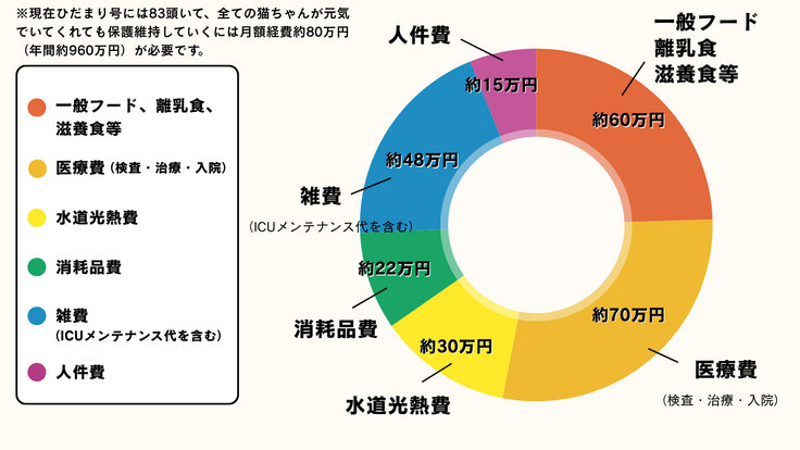 コロナ禍以降から売上減少やシェルターの改装費、ICUのメンテナンス費用、猫たちの介護・医療費、隔離部屋の増設費など、厳しい資金状況が続いており、皆様のご支援が必要です。