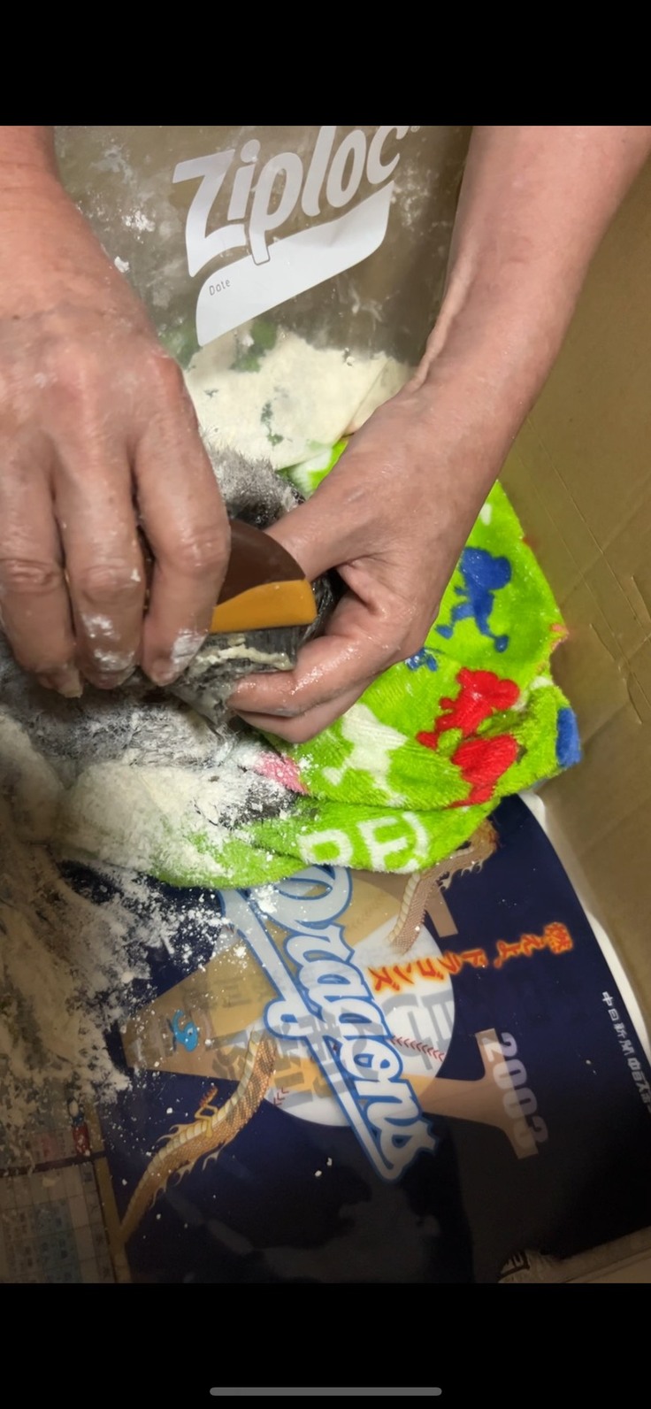 小麦粉をまぶし吸着力がなくなるまで揉みほぐします。そこに油を塗って粘着力をなくし、くしでといていきます。