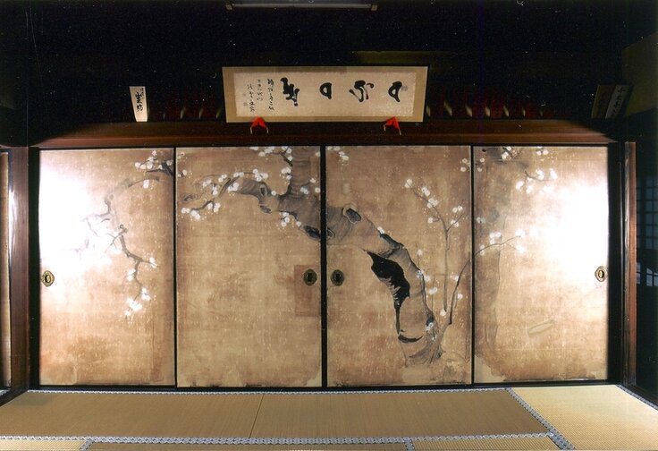 岐阜県指定文化財となっている桜の間襖絵は、山桜の老木と花が墨絵と顔料で描かれた作品で、江戸時代中〜後期の絵師・三熊思孝によって天明7年(1787)に描かれました。