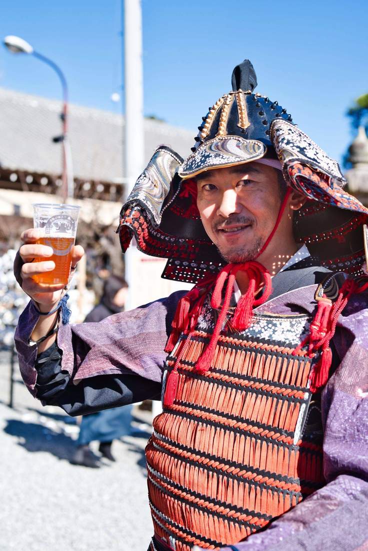この写真はお借りした鎧兜によるイメージですし、ガイド中にビールは飲みませんが、まず、柱としたいのが、時代衣装を着てのガイドです。