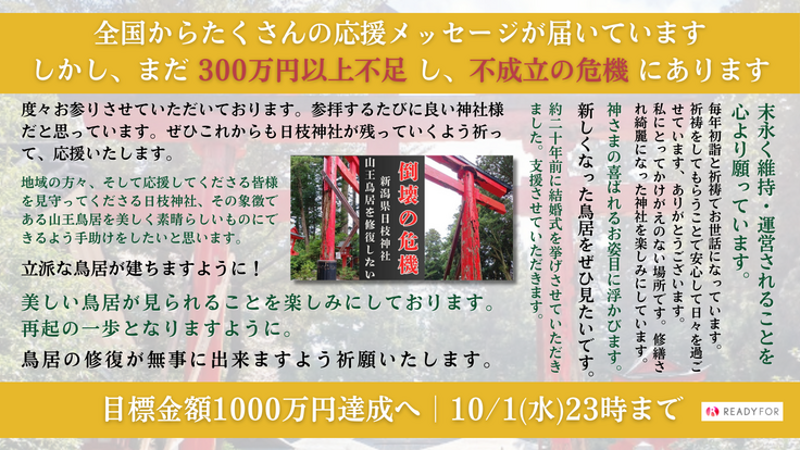 地元出身であるという方々を含め、全国から沢山の応援の声をいただき、大変励みになっております。下を向いているわけにはいきません。皆様からの応援の気持ちを無下にすることがないよう、なんとかプロジェクトを達成させていきたいと思っております。