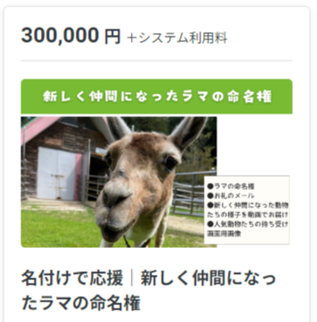本日紹介するのは今回のクラウドファンディングで導入予定のラマのオス、メスそれぞれに名前を付けられる権利です。