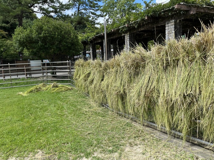 なので、せっかくもらった稲をふじ子さんに長い間楽しんでもらうために、飼育員総出でいい塩梅に束ねて、こうやってラマ舎の柵に干しているんです。