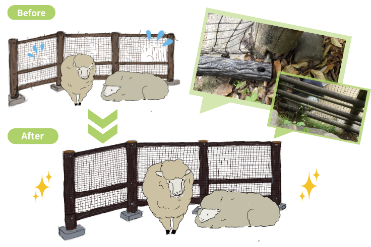 また、ラマ舎内の扉やふれあい広場の柵の腐食もひどくなっているため、ここも壊れる前に修繕することで、新しい仲間とゆくゆくはその子どもたちが安全に快適に過ごせる環境を整えていきたいと思います。