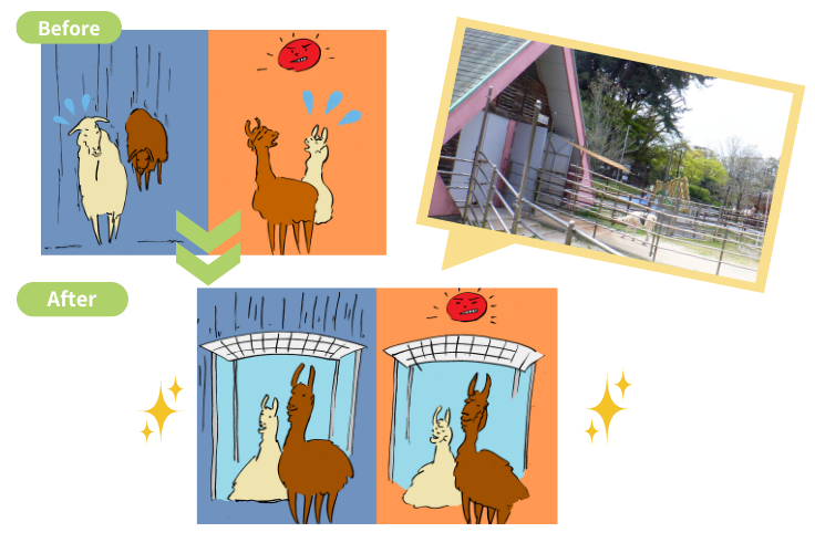 その中でも、まずはラマ舎の改修をしたいと思います。現在のラマ舎は40年近く前に建てられたもので、放飼場には日陰が少なく雨風をしのぐ場所もありません。年々日差しも強くなっていく中、さらには新しいラマ達が増えることを考えると、雨除けと日除けの屋根を設置したいと思います。