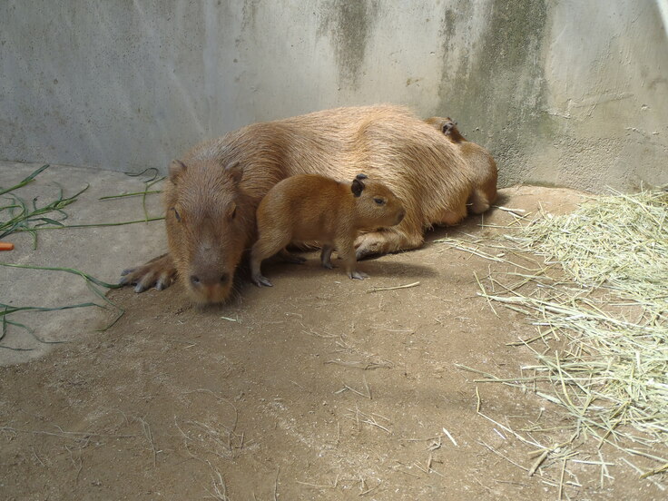 ちなみに、こどもはお母さんの母乳で育ちますが、すでに歯が生えています。2~3日すると大人のカピバラと同じ食べ物を少しずつ食べるようになります。