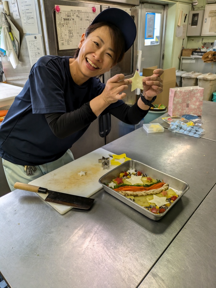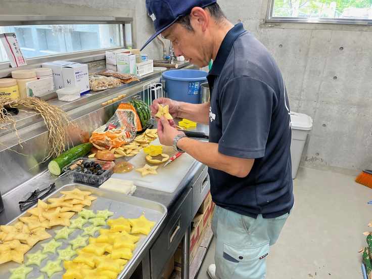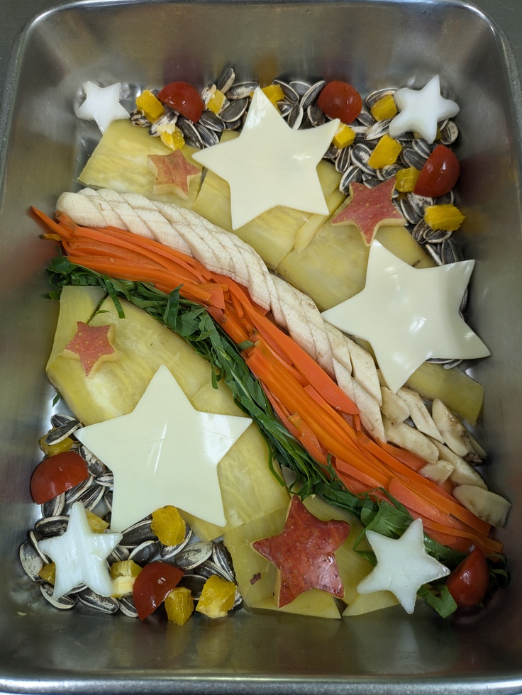 こちらはでは普段食べているニンジンを細かくカットしての天の川に見立て、その周りにリンゴのお星さまをあしらった特製七夕プレートを用意してプレゼントしました。