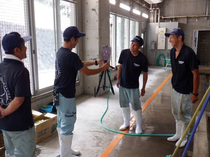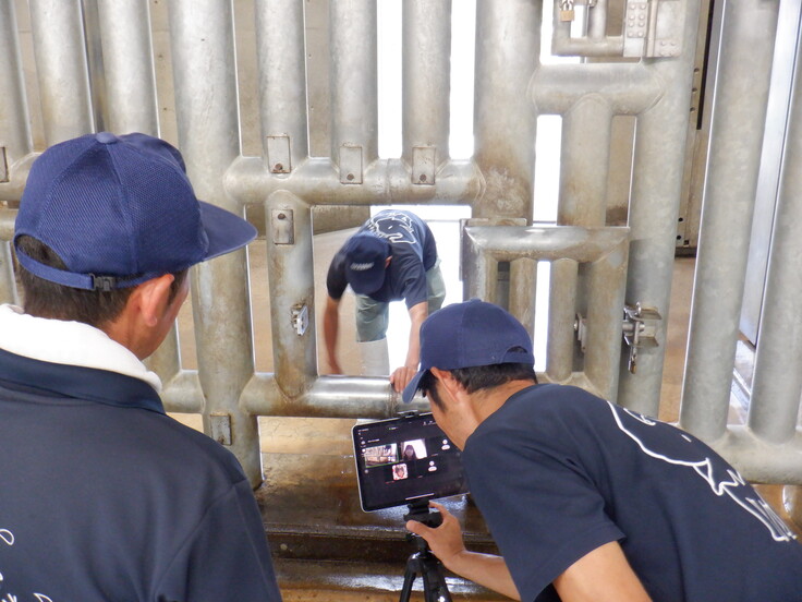 ふじ子さんトーク終了後、放飼場にいるふじ子さんを収容し舎内でのトレーニングを見て頂きました。朝からバタバタしていていつもと違う雰囲気の中ではありましたが、ふじ子さんはいつも通りの種目をしっかりこなしてくれました。