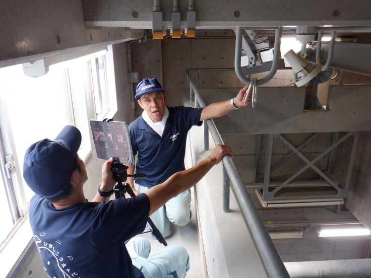 夏休みに行っている「うらがわ探検」のコースでも回る飼料庫、調理室、ふじ子さんの寝室を見てもらった後に、オンライン限定のコースとして寝室の上にある管理通路とさらにその上の屋上にあがり、通常は見ることのできない場所、景色を特別にご覧いただきました。