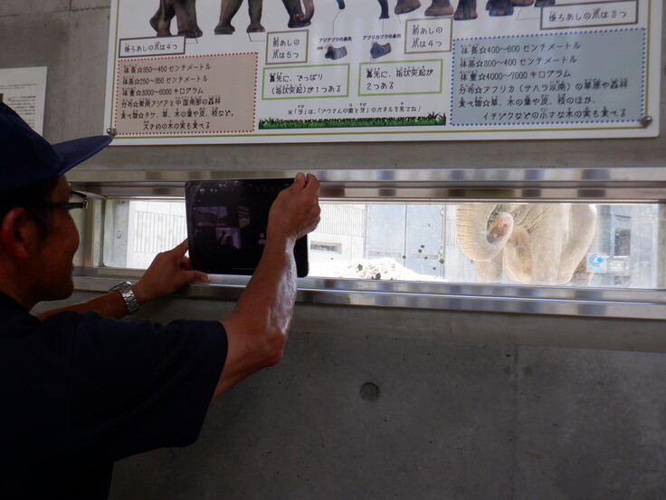 今回はオンラインでの体験という事で、ご支援いただいた皆様とゾウ舎をZOOMで繋ぎ、私たちがカメラをもって移動してその映像を見て、会話をしながら参加して頂きました。