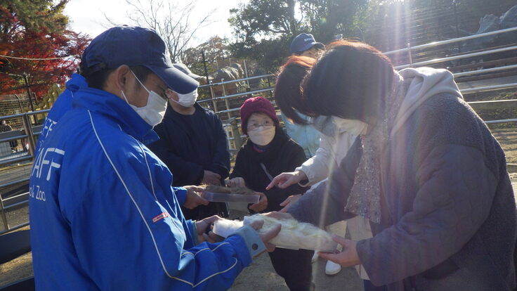 最初に新しく来たむぎくん、まめちゃんと先住のアムールくんの紹介をし、エサやりをしていただきました。エサが欲しくて興奮気味のむぎくん、まめちゃんを見て食いしん坊のアムールくんも負けじと元気にアピールを始め、こういう場面を見ると若い子が来たことで、アムールくんにもたくさんの刺激になっているのだなと実感しました。
