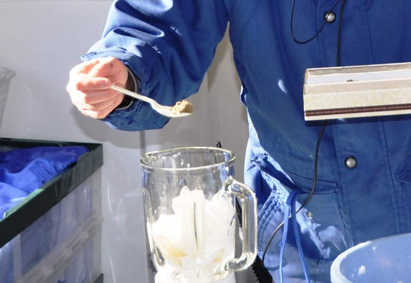 やぶいた牛乳パックと滅菌処理して乾燥させた「コアラのウンチ」を入れて、ミキサーで混ぜます。